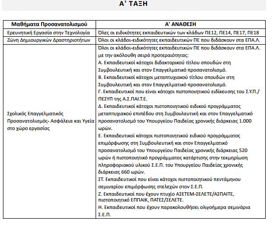 Ζ. Οι εκπαιδευτικοί των ειδικοτήτων ΠΕ18 (01, 26, 27, 28, 29) των ΕΠΑΛ μπορεί να διατίθενται σε σχολικές μονάδες της Πρωτοβάθμιας Εκπαίδευσης για την διδασκαλία του μαθήματος των Εικαστικών. Η. Τα μαθήματα ανατίθενται στους εκπαιδευτικούς με την εξής σειρά προτεραιότητας: Ο/Η εκπαιδευτικός διδάσκει: