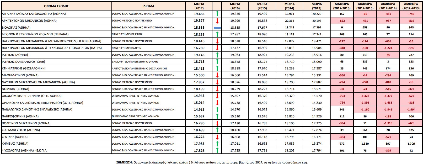 Η ΟΙΕΛΕ παρουσιάζει (επισυναπτόμενος πίνακας) σύγκριση των «βάσεων» εισαγωγής σε επιλεγμένες και αντιπροσωπευτικές Σχολές/Τμήματα της Τριτοβάθμιας Εκπαίδευσης κατά τη διάρκεια των 5 τελευταίων ετών (2013-2017).