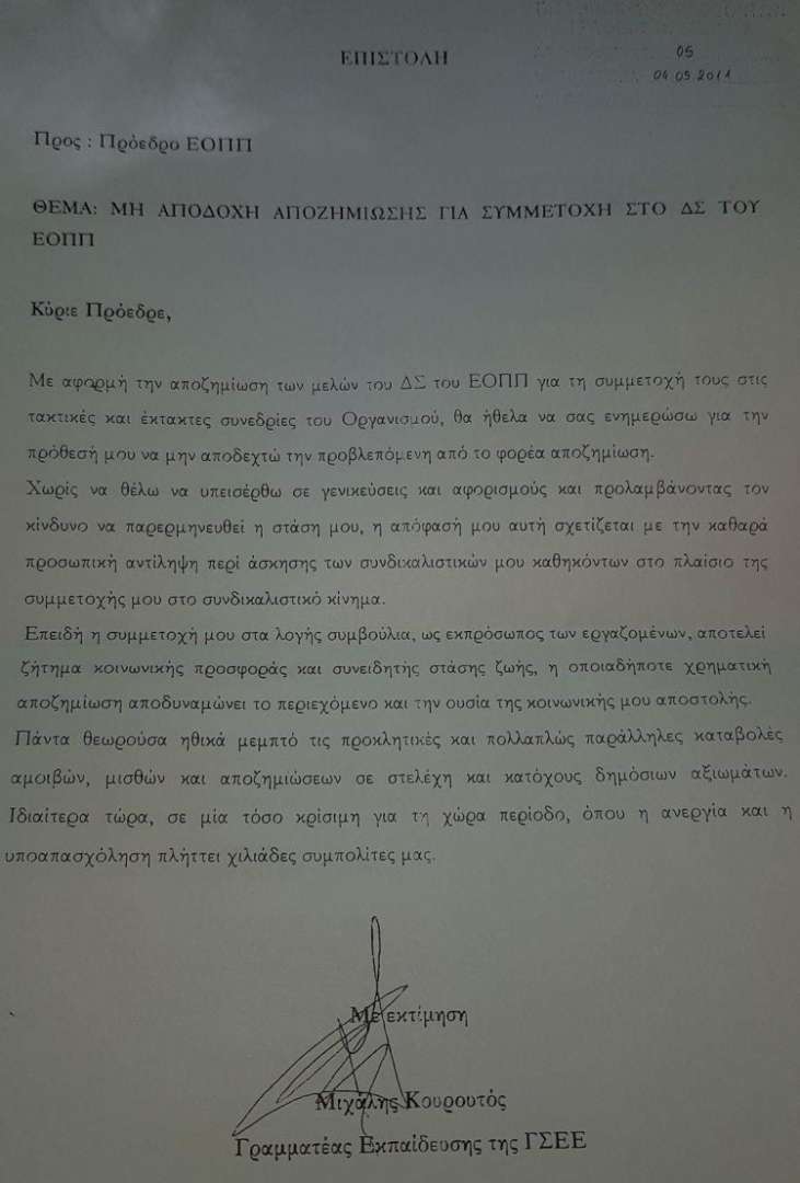 Επειδή έχει το θράσος να μιλά για οικονομικές σχέσεις και διαπλοκή, δημοσιεύουμε την επιστολή παραίτησης του Μ. Κουρουτού (συνημμένη), εκπροσώπου της ΓΣΕΕ στο ΔΣ του ΕΟΠΠΕΠ, από κάθε οικονομική αποζημίωση από τον Οργανισμό. Ας μας απαντήσει όμως: Ο ίδιος είχε οικονομική σχέση με τον ΕΟΠΠΕΠ και τους μητρικούς του φορείς ναι, ή όχι; Θα μας αποκαλύψει τις αμοιβές που έλαβε για τα έργα που ανέλαβε;