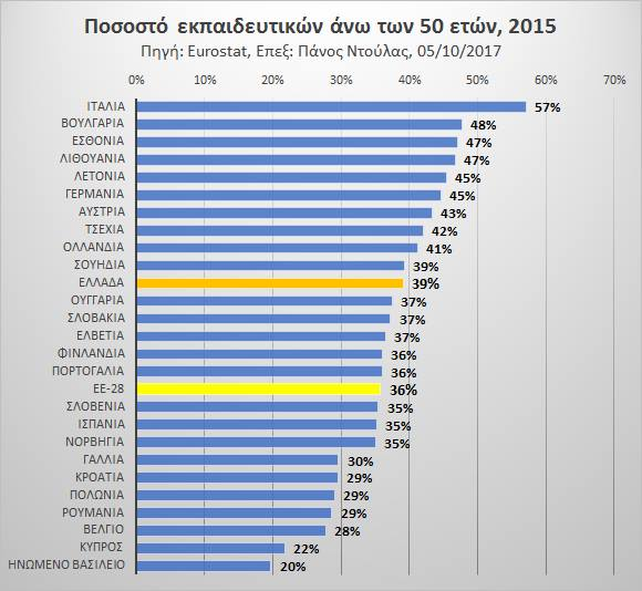 Ο μέσος όρος της Ευρωπαϊκής Ένωσης είναι 36% και η χώρα μας βρίσκεται πάνω από το μέσο όρο, φυσικά, αλλά δεν συγκαταλέγεται και στις χώρες που έχουν πολύ υψηλό ποσοστό εκπαιδευτικών άνω των 50.