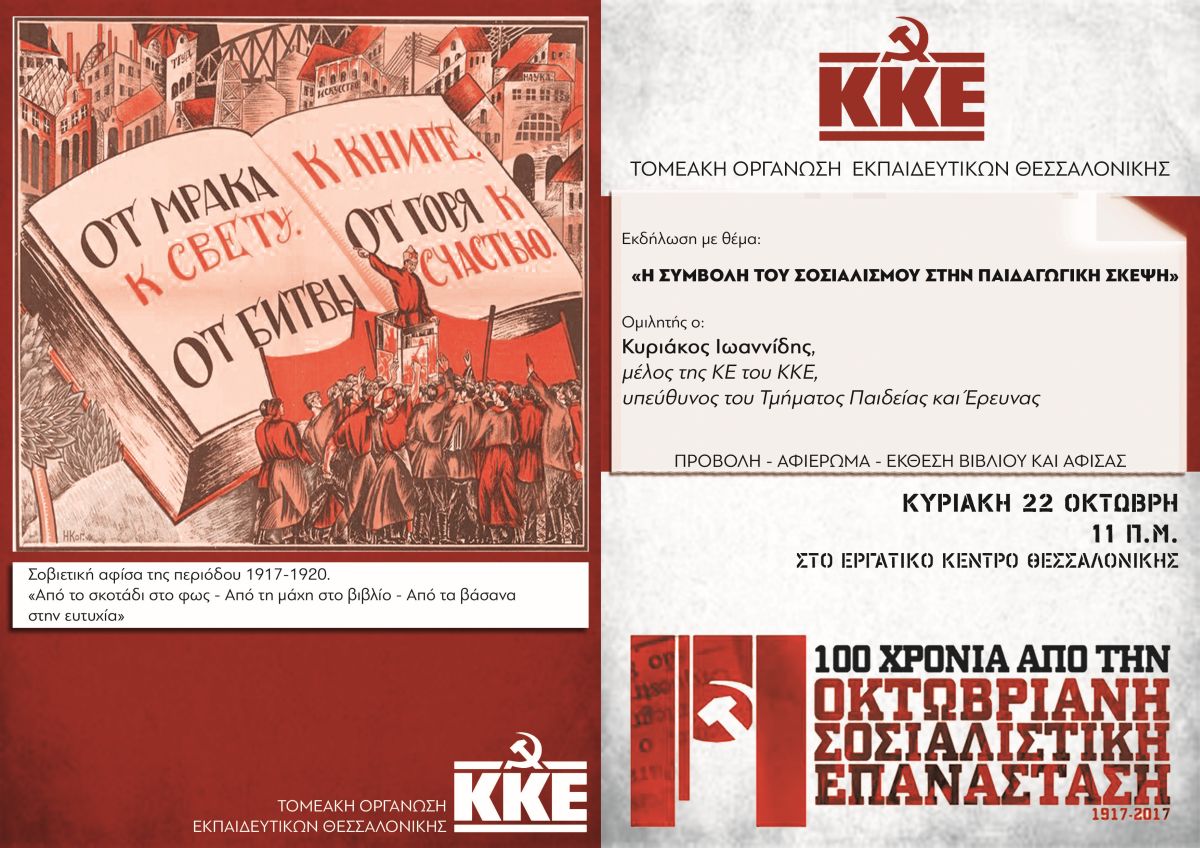 Τιμώντας την Οκτωβριανή Επανάσταση και τη συμβολή του σοσιαλισμού στην παιδεία του λαού, σήμερα συνεχίζουμε. Το ΚΚΕ καταθέτει πρόταση διεξόδου από την καπιταλιστική βαρβαρότητα. Αυτήν της ρεαλιστικότητας και αναγκαιότητας του σοσιαλισμού. Σε αυτά τα πλαίσια έχει ολοκληρωμένη πρόταση για το σχολείο και το Πανεπιστήμιο των σύγχρονων αναγκών και δυνατοτήτων της εποχής μας. Το Ενιαίο Δωδεκάχρονο Σχολείο Σύγχρονης Γενικής Παιδείας και αντίστοιχα ένα σύστημα Ενιαίας Ανώτατης Εκπαίδευσης, που προτείνει το ΚΚΕ σήμερα, πιάνει το νήμα της σοσιαλιστικής παιδαγωγικής πείρας και της προσπάθειας να δοθεί σε όλους ποιοτικά αναβαθμισμένη επιστημονική γνώση, αξιοποιώντας και ωθώντας στη σύνδεση θεωρίας και πράξης.