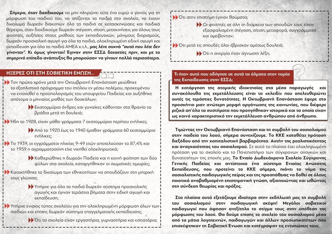 Σήμερα, όταν διεκδικούμε να μην πληρώνει ούτε ένα ευρώ ο γονιός για τη μόρφωση του παιδιού του, να σιτίζονται τα παιδιά στο σχολείο, να έχουν δικαίωμα δωρεάν διακοπών όλα τα παιδιά σε κατασκηνώσεις και παιδικά θέρετρα, όταν διεκδικούμε δωρεάν στέγαση, σίτιση, μετακινήσεις για όλους τους φοιτητές, αυξήσεις στους μισθούς των εκπαιδευτικών, μόνιμους διορισμούς, δωρεάν προσχολική αγωγή για όλα τα παιδιά, ολοκληρωμένη ειδική αγωγή και εκπαίδευση για όλα τα παιδιά AΜΕΑ κ.τ.λ., μας λένε συχνά «αυτά που λέτε δεν γίνονται». Κι όμως γίνονται! Έγιναν στην ΕΣΣΔ δεκαετίες πριν, και με το σημερινό επίπεδο ανάπτυξης θα μπορούσαν να γίνουν πολλά περισσότερα.