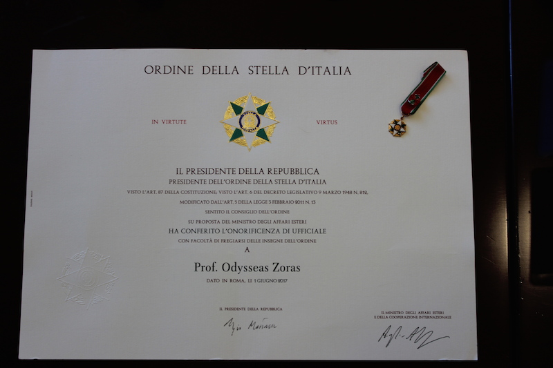 O Πρύτανης του Πανεπιστημίου Κρήτης, Καθηγητής Οδυσσέας Ζώρας, τιμήθηκε από τον Πρόεδρο της Ιταλικής Δημοκρατίας Sergio Mattarella με το Σταυρό του Αξιωματούχου της Λεγεώνας της Τιμής.