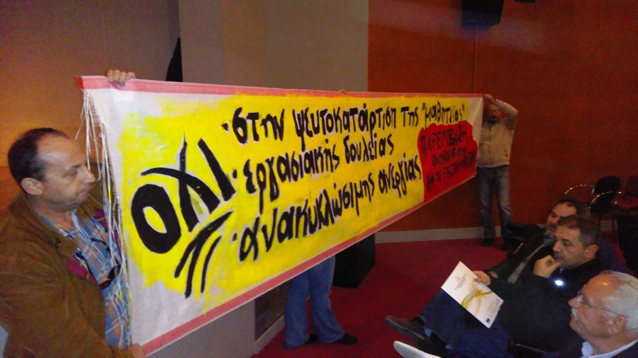Μαζική παρέμβαση με συνθήματα και πανό πραγματοποίησαν μέλη της ΕΛΜΕ Χανίων, το πρωί της Παρασκευής στο Πνευματικό Κέντρο της πόλης, όπου πραγματοποιούνταν εκδήλωση για το Πρόγραμμα Πιλοτικής Τάξης Μαθητείας στα ΕΠΑΛ, παρουσία του Υφυπουργού Παιδείας, Δημήτρη Μπαξεβανάκη.