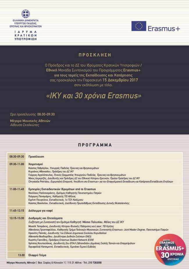 Το Ίδρυμα Κρατικών Υποτροφιών θα πραγματοποιήσει εκδήλωση με θέμα τον εορτασμό των 65 χρόνων πορείας ως Εθνικός Φορέας Υποτροφιών και 30 χρόνων λειτουργίας ως Εθνική Μονάδα των ευρωπαϊκών προγραμμάτων για την εκπαίδευση και την κατάρτιση.