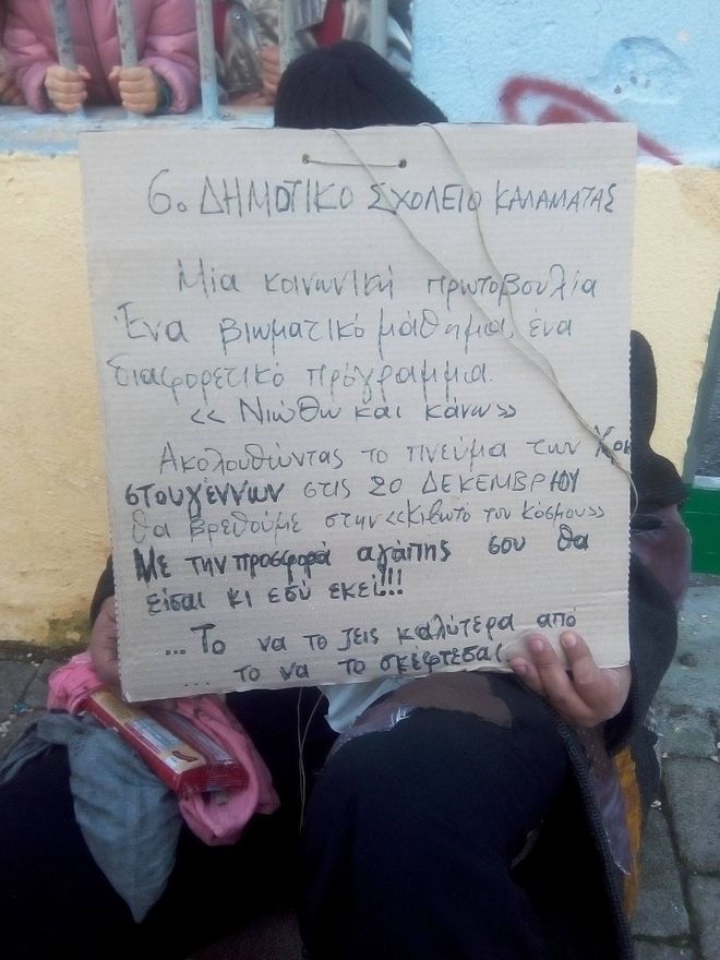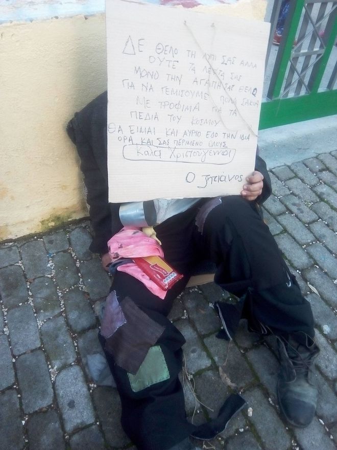 Με παλιά ρούχα, σχεδόν κουρέλια, ρακένδυτος, καθόταν το πρωί έξω από το σχολείο, κρατώντας μια πινακίδα που έγραφε με αρκετά ορθογραφικά λάθη, ώστε να είναι πιο πολύ πιστευτός στο ρόλο του : “Δεν θέλω τη λύπη σας, αλλά ούτε τα λεφτά σας, μόνο την αγάπη σας θέλω, για να γεμίσουμε πολλά σακιά με τρόφιμα για τα παιδιά του κόσμου. Θα είμαι και αύριο εδώ, την ίδια ώρα να σας περιμένω. Καλά Χριστούγεννα σε όλους! Ο Ζητιάνος”.