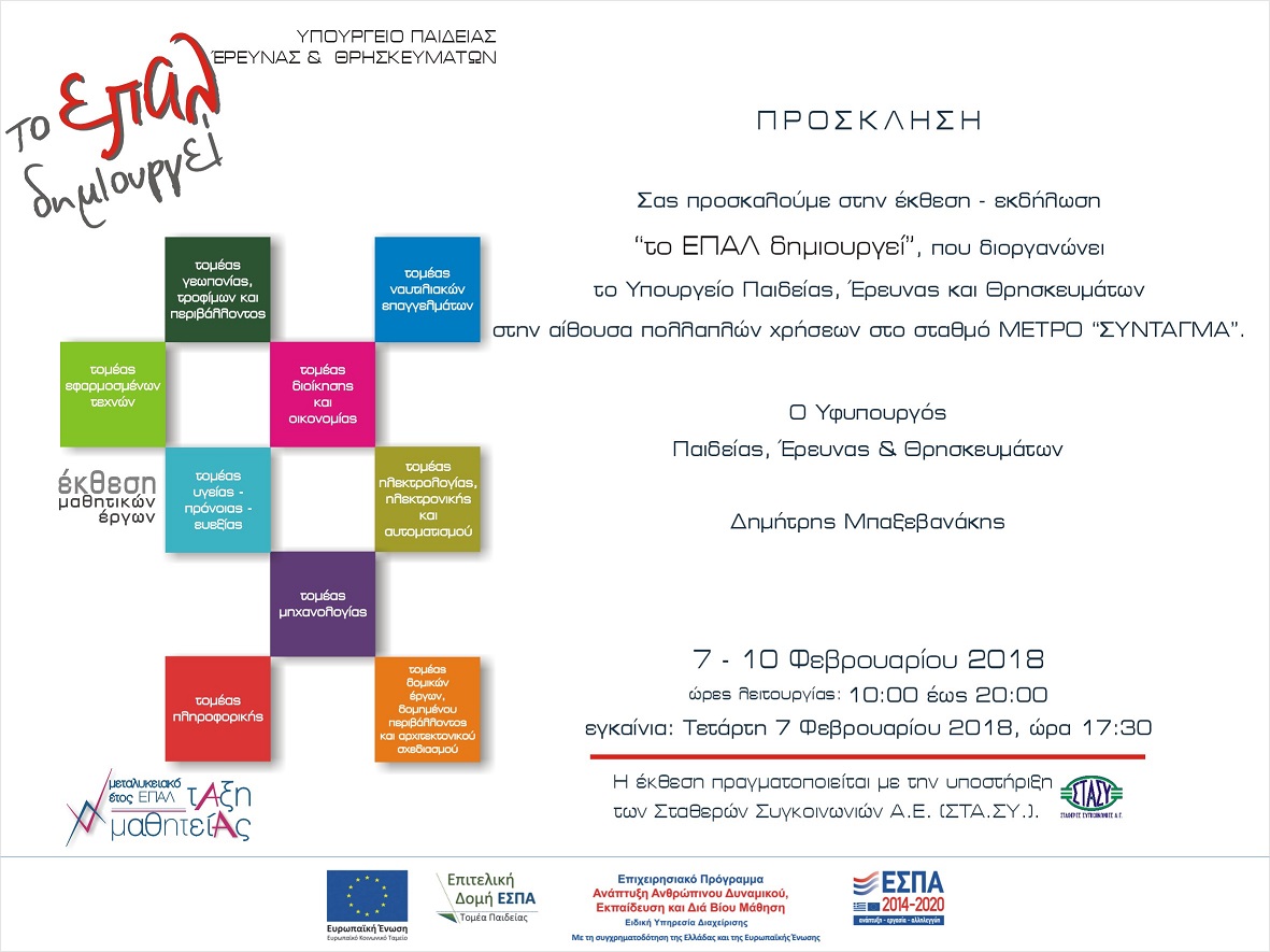 Το Υπουργείο Παιδείας, Έρευνας και Θρησκευμάτων διοργανώνει από 7 έως και 10 Φεβρουαρίου 2018 έκθεση - εκδήλωση με τίτλο «Το ΕΠΑ.Λ. δημιουργεί» στο χώρο (αίθουσα) πολλαπλών χρήσεων στο σταθμό του μετρό στο Σύνταγμα.