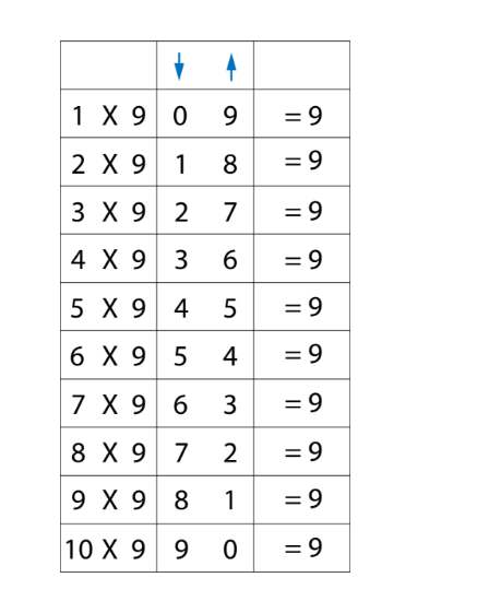 Αν βάλουμε στη σειρά τα γινόμενα της προπαίδειας του 9 θα δούμε ότι το πρώτο ψηφίο τους δημιουργεί μία σειρά αριθμών από το 0 έως το 9, ενώ δίπλα τους τα δεύτερα ψηφία μία ανάποδη, από το 9 έως το 0. Το νούμερο με το οποίο πολλαπλασιάζεις το 9 παράγει έναν αριθμό ο οποίος αρχίζει με τον αμέσως προηγούμενό του. Παράλληλα, αν προστεθούν τα δύο ψηφία από κάθε γινόμενο κάνουν 9! Δηλαδή, όταν θα πολλαπλασιάζεις το 9 με το 6, θα ξέρεις ότι το νούμερο που ψάχνεις θα αρχίζει με το 5 (το 5 είναι ο αμέσως προηγούμενος αριθμός του 6), 9-5=4 άρα το δεύτερο ψηφίο είναι το 4, άρα 9χ6=54!\