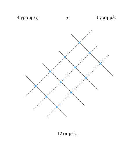 Για τις ώρες που το μυαλό έχει κολλήσει και δεν θυμάται, τράβα γραμμές! Εάν τραβήξουμε τόσες παράλληλες γραμμές όσες ο ένας αριθμός του πολλαπλασιασμού, και τραβήξουμε προς τη αντίθετη κατεύθυνση άλλες παράλληλες γραμμές τόσες όσες είναι ο δεύτερος αριθμός του πολλαπλασιασμού και μετρήσουμε τα σημεία που τέμνονται θα βρούμε το γινόμενο του.