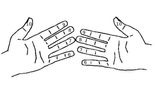 Και όταν οι προπαίδεια μέχρι το 5 θα είναι εύκολη υπόθεση, αλλά από το 6 και μετά η κατάσταση θυμίζει ναυάγιο, τότε αυτό το κόλπο είναι αναγκαίο. Αντιστοιχίζοντας κάθε δάχτυλο με ένα νούμερο από το 6 έως το 10 όπως στην εικόνα, η προπαίδεια αυτών των δύσκολων αριθμών γίνεται ευκολότερη. Για κάθε πολλαπλασιασμό, αρχικά λυγίζουμε τα χέρια που αντιστοιχούν στους αριθμούς της πράξης (έστω ότι έχουμε το 6χ8, τότε λυγίζουμε στο ένα χέρι το δάχτυλο του 6 και στο άλλο τα δάχτυλα με τους αριθμούς 6,7 και 8). Έπειτα, μετράμε τα χέρια που έχουμε λυγίσει και τα αντιστοιχούμε σε δεκάδες (1 στο ένα χέρι και 3 στο άλλο ίσον 4 δεκάδες, άρα 40). Στη συνέχεια, μετράμε τα δάχτυλα που μείνανε και τα πολλαπλασιάζουμε μεταξύ τους (4 στο ένα χέρι και 2 στο άλλο, άρα 4χ2=8). Τέλος προσθέτουμε τις δεκάδες με το γινόμενο και βρίσκουμε πόσο κάνει ο αρχικός, δύσκολος πολλαπλασιασμός (Δηλαδή 40+8=48).