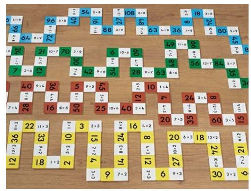 Αυτό το παιχνίδι είναι κάτι μεταξύ του ντόμινο και της βεντάλιας. Όπως φαίνεται παρακάτω στην εικόνα, παίρνουμε μία μακριά λωρίδα χαρτί και την τσακίζουμε 10 φορές. Σε κάθε τσάκισμα ζωγραφίζουμε τόσες κουκίδες όσες και ο αριθμός στον οποίο θέλουμε να εξασκηθούμε. Στο μέρος που αποκαλύπτεται πρώτο γράφουμε πάνω το γινόμενο που προκύπτει όταν πολλαπλασιάσουμε τον αριθμό με το 1, στο επόμενο με το 2 και ούτω καθεξής. Στο μέρος του χαρτιού το οποίο όπως το βλέπουμε βρίσκεται δίπλα από τις κουκκίδες γράφουμε την πράξη. Έτσι όσο ξετυλίγεται το χαρτί αποκαλύπτονται οι πράξεις με το γινόμενο τους σε αναπαράσταση.