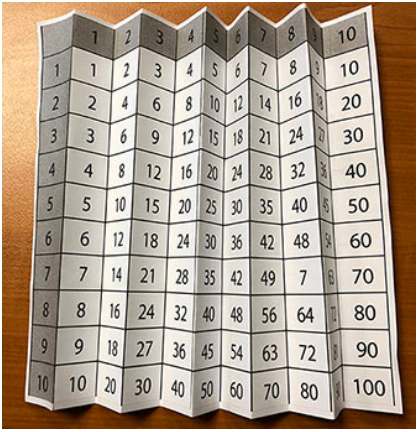 Έχοντας δημιουργήσει τον παραπάνω πίνακα με όλη την προπαίδεια, μπορούμε να τον τσακίσουμε σε κάθε κάθετη γραμμή και να δημιουργήσουμε μία άλλου είδους… βεντάλια! Με αυτόν τον τρόπο οι απαντήσεις κάθε προπαίδειας θα είναι κρυμμένες, και μόνο αν τα παιδιά απαντήσουν θα μπορούν να τις αποκαλύψουν και να δουν αν ήταν σωστά ή λάθος.