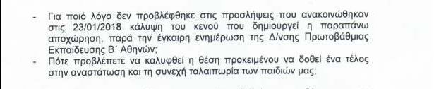 Όπως γνωρίζετε η φοίτηση και άρτια ολοκλήρωση της Π.Ε. είναι νόμιμο συνταγματικό δικαίωμα, αλλά και υποχρέωση όλων των μαθητών ανά την επικράτεια. Ας ληφθεί μάλιστα υπόψη ότι όλο αυτό λαμβάνει χώρα χωρίς καμία υπαιτιότητα εκ μέρους της διοίκησης του σχολείου η οποία ενημέρωσε τη Δ/νση Π.Ε. για αναπλήρωση του κενού από τις 12-01-2018. Επίσης εμεί ως γονείς, έχουμε επανειλημμένα ενημερώσει για την απουσία της εκπαιδευτικού του τμήματος και την άμεση ανάγκη επίλυσής του προβλήματος.