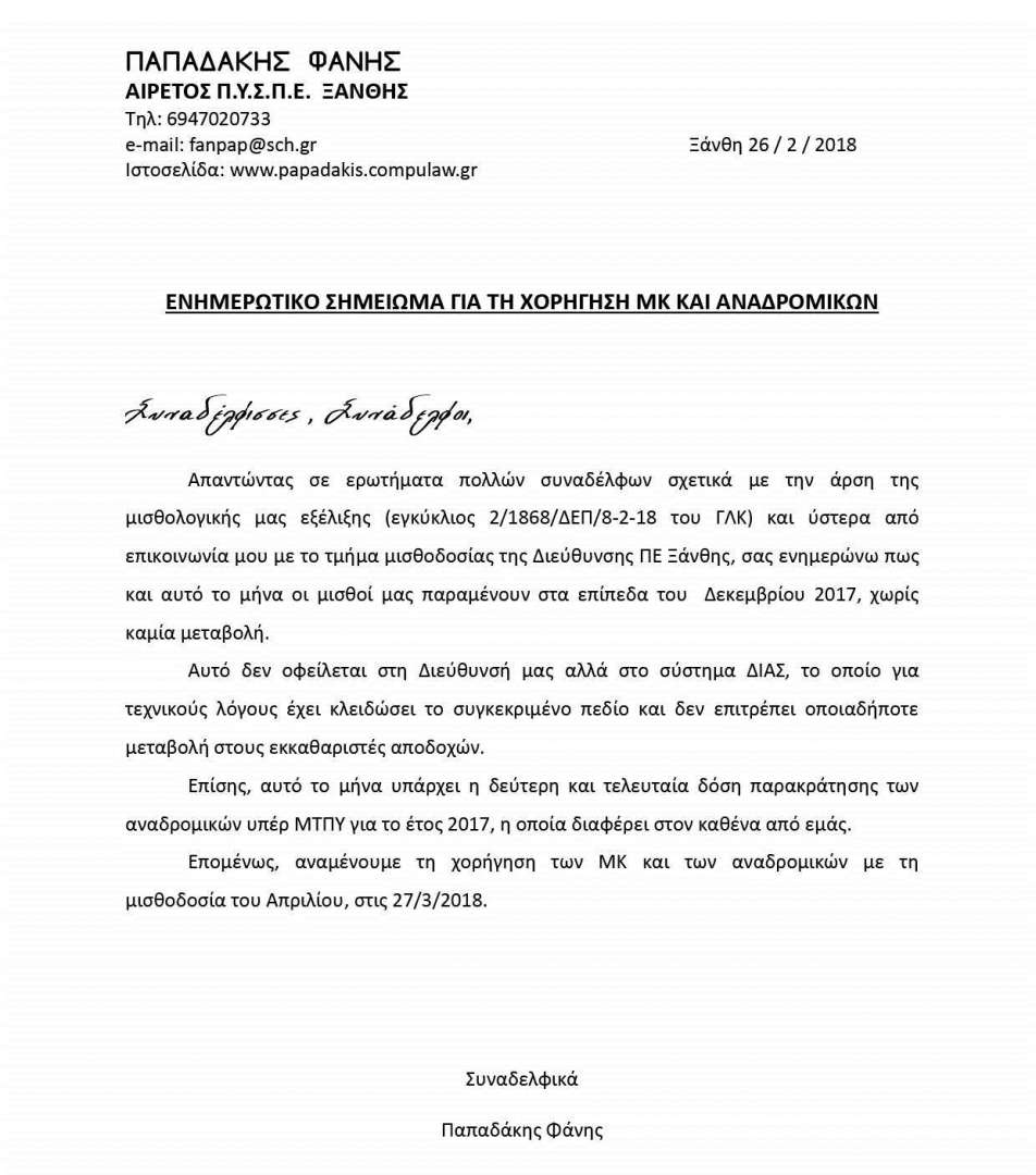 Ο αιρετός του ΠΥΣΠΕ Ξάνθης Φάνης Παπαδάκης ενημερώνει σχετικά με τη χορήγηση ΜΚ και αναδρομικών.