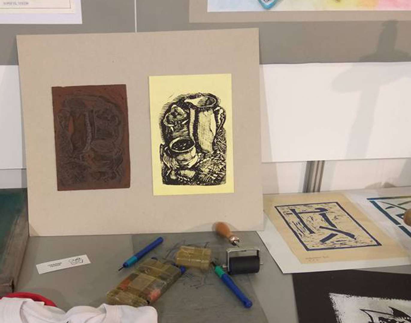 β) έτοιμη εργασία χαρακτικής και εκτύπωσης (από λινόλεουμ), είναι μία δράση που θα πραγματοποιηθεί στο χώρο του περιπτέρου και θα δίνεται στους ενδιαφερόμενους το τυπωμένο χαρακτικό. Δηλαδή, θα υπάρχουν έτοιμα λινόλεουμ χαραγμένα (εργασίες μαθητών από σχολεία) με ένα εικαστικό θέμα και εκείνη τη στιγμή θα γίνεται η εκτύπωση