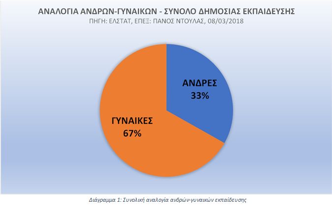 Στην ελληνική εκπαίδευση, με βάση τα τελευταία διαθέσιμα στοιχεία της ΕΛΣΤΑΤ για το έτος 2014-15 (πχ εδώ: (ΕΛΣΤΑΤ, 2014), αναλυτικά όλα τα στοιχεία στη Βιβλιογραφία), περίπου τα δύο τρίτα των εκπαιδευτικών είναι γυναίκες, αναλογούν δηλ συνολικά (σε όλες τις βαθμίδες) περίπου δύο γυναίκες εκπαιδευτικοί για κάθε έναν άνδρα, όπως φαίνεται στο Διάγραμμα 1: