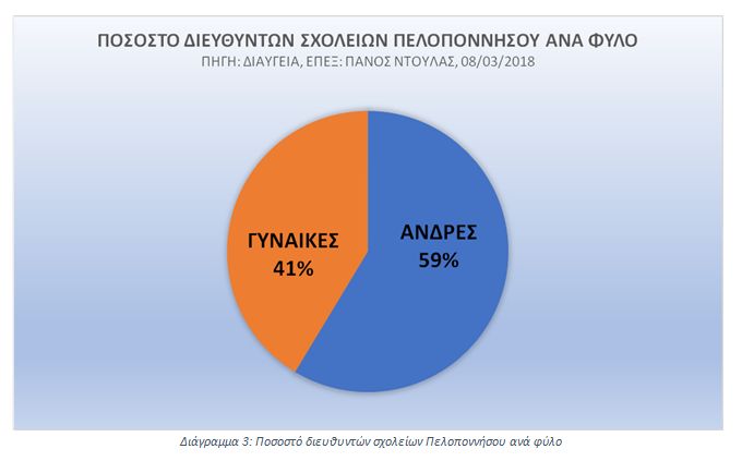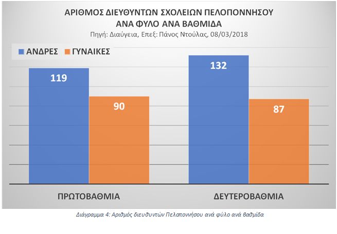 Οι Διευθυντές σχολικών μονάδων, με βάση τις τελευταίες Κρίσεις Στελεχών, έτσι όπως φαίνονται στις αποφάσεις της ΠΔΕ Πελοποννήσου (πχ εδώ: (ΠΔΕ ΠΕΛΟΠΟΝΝΗΣΟΥ, 2018) και αναλυτικά όλες στη Βιβλιογραφία), είναι κατά πλειοψηφία άνδρες: