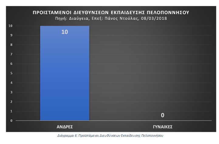Μάλιστα, αν πάμε ψηλότερα στην ιεραρχία, διαπιστώνουμε συντριπτικά ποσοστά όπως φαίνονται στο Διάγραμμα 6: και στις δέκα Διευθύνσεις Εκπαίδευσης (πέντε για κάθε βαθμίδα), ο Διευθυντής είναι άντρας, όπως άλλωστε είναι κι ο Περιφερειακός Διευθυντής Εκπαίδευσης και όλη η πολιτική ηγεσία του Υπουργείου Παιδείας.