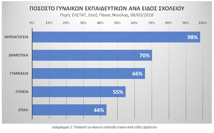 Αυτό το μεγάλο ποσοστό διαφέρει ανά είδους σχολείου/βαθμίδα. Βλέπουμε από το παρακάτω Διάγραμμα 2 ότι σχεδόν παντού (και πιο καθαρά στην Πρωτοβάθμια εκπαίδευση) οι γυναίκες αποτελούν την πλειοψηφία: