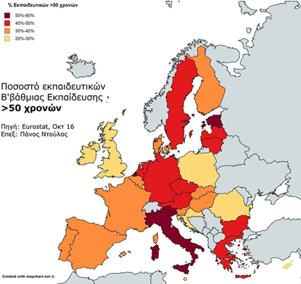 Στον επόμενο χάρτη [(ΝΤΟΥΛΑΣ, Η μέση ηλικία καθηγητών στην Ευρώπη, 2016)] βλέπουμε την καταγραφή της μέσης ηλικίας καθηγητών στην Ευρώπη σύμφωνα με τα επίσημα στοιχεία της Eurostat με στοιχεία πριν το 2016!
