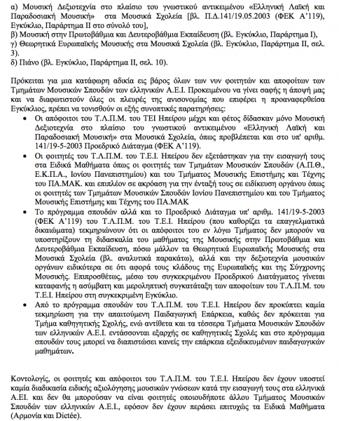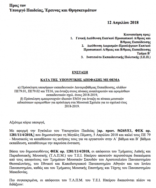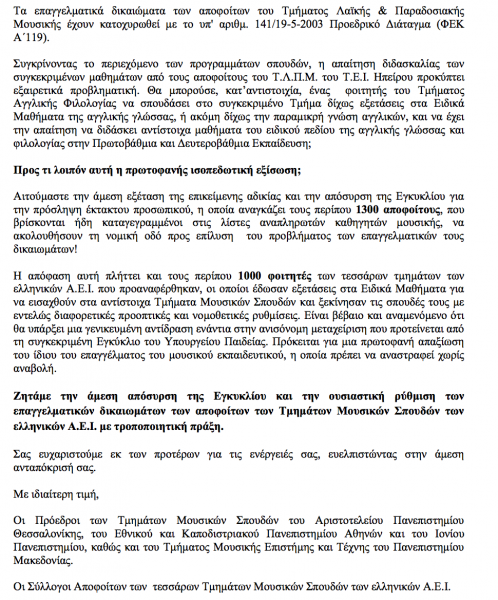 Ένσταση για την εγκύκλιο των αναπληρωτών ΠΕ 79- Μουσικοί κατέθεσαν σήμερα στον υπουργό Παιδείας, Κώστα Γαβρόγλου, οι Πρόεδροι των Τμημάτων και των Συλλόγων αποφοίτων των Μουσικών Σπουδών Ιονίου Πανεπιστημίου, Μουσικής Επιστήμης & Τέχνης του ΠΑΜΑΚ, Μουσικών Σπουδών ΕΚΠΑ και Μουσικών Σπουδών ΑΠΘ.