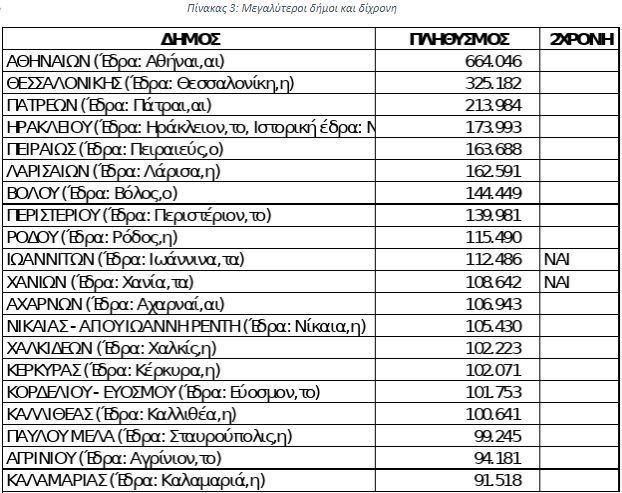 Είναι χαρακτηριστικό ότι, αν δούμε τους 20 μεγαλύτερους σε πληθυσμό Δήμους της χώρας, που συγκεντρώνουν το ένα τρίτο του συνολικού πληθυσμού της Ελλάδας, μόνο σε δύο (Γιάννενα και Χανιά) εγκρίθηκε η δίχρονη, όπως δείχνει ο Πίνακας 3: