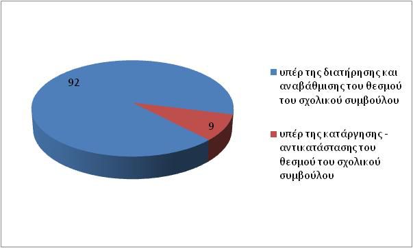 - Υποβλήθηκαν 128 σχόλια τα οποία παίρνουν ξεκάθαρη θέση για τη διατήρηση ή κατάργηση του θεσμού του σχολικού συμβούλου.Από τα 128 σχόλια, τα 102 σχόλια τάσσονται αναφανδόν υπέρ της διατήρησης του θεσμού του σχολικού συμβούλου, πολλά από αυτά προτείνοντας την αυτονόητη ανάγκη αναβάθμισης του θεσμού.
