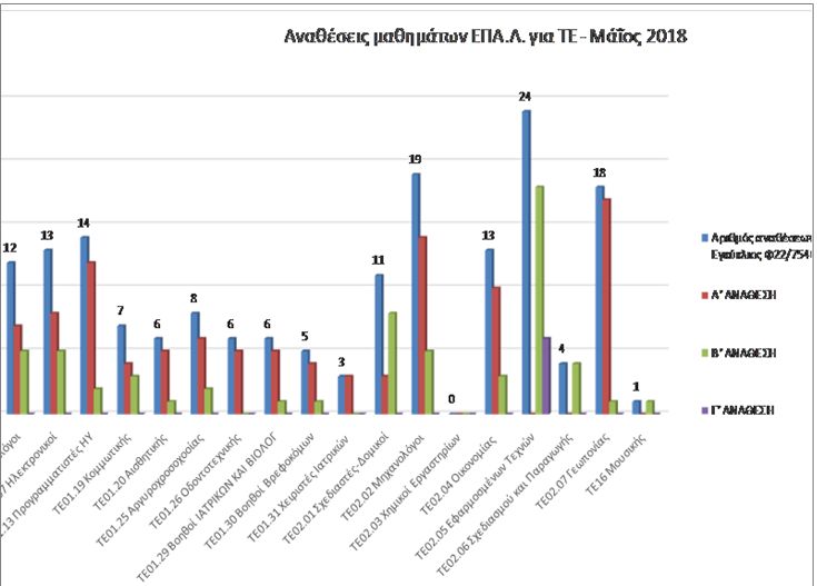 Ενδεικτικά αναφέρουμε μερικές ειδικότητες που έχουν πολύ μικρό αριθμό μαθημάτων σε Α’ ανάθεση: ΤΕ01-04, ΤΕ01.13, ενοποιημένη ειδικότητα ΤΕ02.05 (πρώην ΤΕ01.17), και ειδικά στους ΤΕ01.14 Γραφικών Τεχνών, ΤΕ01.31 Χειριστές Ιατρικών Συσκευών ,ΤΕ02.03, ΤΕ02.06 κ.λ.π. Στο παρακάτω στατιστικό (Στατιστικό 1), μπορείτε να διαπιστώσετε την ανομοιομορφία των αναθέσεων α’, β’ και γ’ ανάθεσης μαθημάτων μεταξύ των κλάδων-ειδικοτήτων ΤΕ.