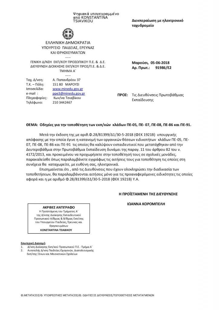 Τοποθετήσεις εκπαιδευτικών κλάδων ΠΕ05, ΠΕ07, ΠΕ08 , ΠΕ86 και ΠΕ91 και γνωστοποίηση ΦΕΚ: