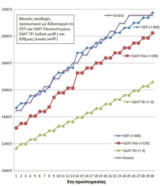 Έτσι, όπως εν μια νυκτί πριν ένα χρόνο (Μάιος 2017) αποφασίστηκε η απομάκρυνση τους από το Ενιαίο Μισθολόγιο στο οποίο τους είχαν αφήσει από το 2016 με το ν.4386,(αρ.27,παρ.3), πάλι εν μια νυκτί ανακοινώνεται η παραμονή τους εσαεί στο 55% του μισθού του Καθηγητή Πανεπιστημίου. Το παρακάτω γράφημα τα λέει όλα για την “ισότιμη”, “ισόνομη” και “δίκαιη” αντιμετώπιση προσωπικού του Υπ.Παιδείας με τα ΙΔΙΑ ακριβώς προσόντα στην Τριτοβάθμια (ειδικό μισθολόγιο) και Δευτεροβάθμια Εκπαίδευση (ενιαίο μισθολόγιο).