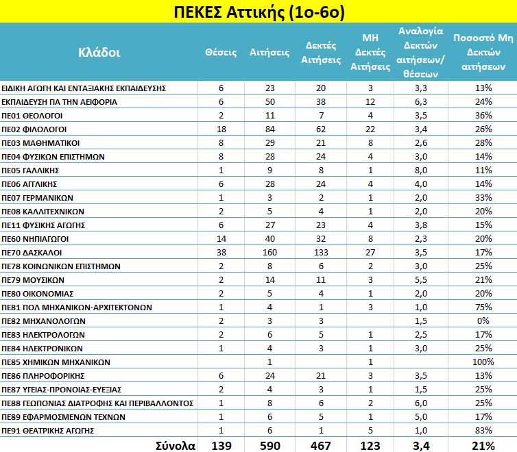 Σας ενημερώνουμε ότι το συμβούλιο επιλογής για τους Συντονιστές Εκπαιδευτικού Έργου συνεδρίασε στις 11/7/2018 με θέμα την κατάρτιση των πινάκων δεκτών και μη δεκτών αιτήσεων. Κατατέθηκαν 590 αιτήσεις για 139 θέσεις που είχαν προκηρυχθεί για τα έξι ΠΕΚΕΣ της περιφέρειας Αττικής. Από αυτές οι 123 δεν έχουν γίνει δεκτές επειδή δεν πληρούσαν τις προϋποθέσεις σύμφωνα με τον Ν.4547/2018. Η κατανομή των θέσεων και των αιτήσεων ανά Κλάδο φαίνεται στον παρακάτω πίνακα: