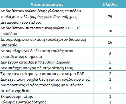Οι 123 αιτήσεις δεν έγιναν δεκτές για τους λόγους που φαίνονται συγκεντρωτικά στον παρακάτω πίνακα: