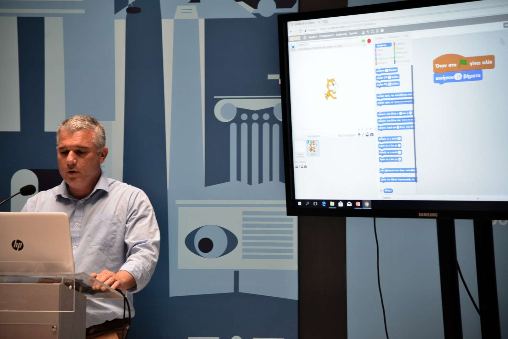 Η Scratch είναι μια γλώσσα οπτικού προγραμματισμού όπου μπορεί κανείς να προγραμματίζει μετακινώντας κατάλληλα πλακίδια και να αναπτύσσει ακόμα και σύνθετες εφαρμογές αλλά και να ενεργοποιεί αισθητήρες, κινητήρες και διόδους που συνδέονται σε πλακέτες Arduino! Στο πλαίσιο της εκδήλωσης θα παρουσιάσουμε τις επιμορφωτικές δράσεις του Ελληνικού Ανοικτού Πανεπιστημίου που εισάγουν βασικές έννοιες προγραμματισμού σε μαθητές και καθηγητές, αξιοποιώντας σύγχρονες μεθοδολογίες και τεχνολογίες εξ αποστάσεως εκπαίδευσης.