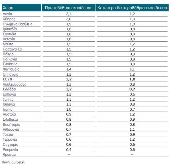 Πίνακας 2: Δημόσια δαπάνη για την πρωτοβάθμια και την κατώτερη δευτεροβάθμια εκπαίδευση ως ποσοστό του ΑΕΠ στις χώρες της ΕΕ (στοιχεία 2014)