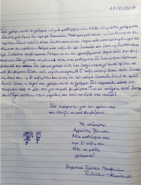 "Σας γράφω αυτό το γράμμα ως μία μαθήτρια που θέλει να μάθει γράμματα. Δυστυχώς όμως δεν έχουμε δασκάλα".