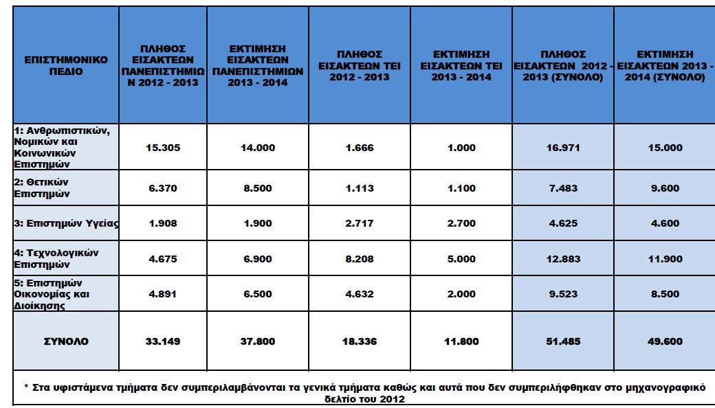 Δείτε στον παραπάνω πίνακα πόσες θέσεις εισακτέων προσφέρονται ανά Επιστημονικό Πεδίο το 2013 σε σύγκριση με το 2012