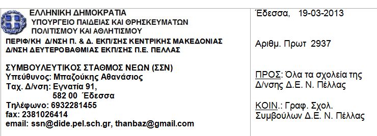 ΠΡΟΣ: Δ/ΝΣΗ Δ/ΘΜΙΑΣ ΕΚΠ/ΣΗΣ ΠΕΛΛΑΣ Εγνατία 91, 582 00 Έδεσσα υπόψη: Αθανασίου Μπαζούκη, υπευθύνου Σ.Σ.Ν. Πέλλας fax: 2381026414 email: thanbaz@gmail.com |