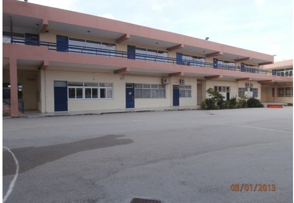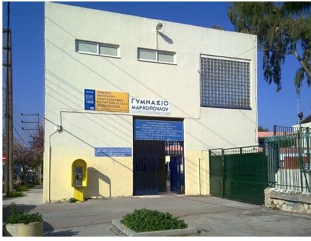 Η είσοδος του κτιριακού συγκροτήματος Ι.Ε.Κ.- 1ου Γυμνασίου Μαρκοπούλου.
