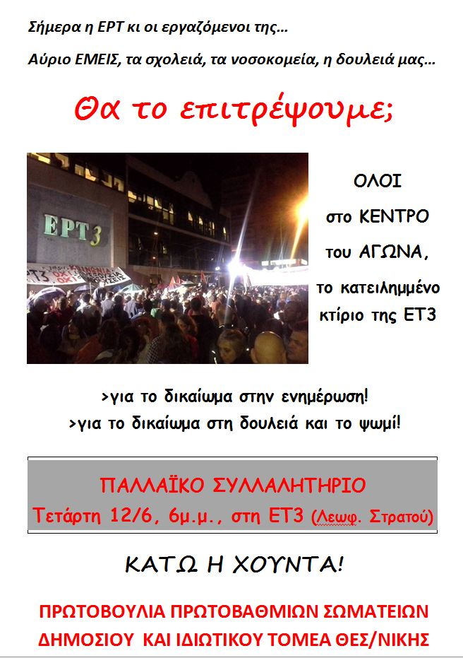 Παλλαικό συλλαλητήριο 12/6 για την ΕΡΤ ΠΡΩΤΟΒΟΥΛΙΑ ΠΡΩΤΟΒΑΘΜΙΩΝ ΣΩΜΑΤΕΙΩΝ ΔΗΜΟΣΙΟΥ  ΚΑΙ ΙΔΙΩΤΙΚΟΥ ΤΟΜΕΑ ΘΕΣ/ΝΙΚΗΣ