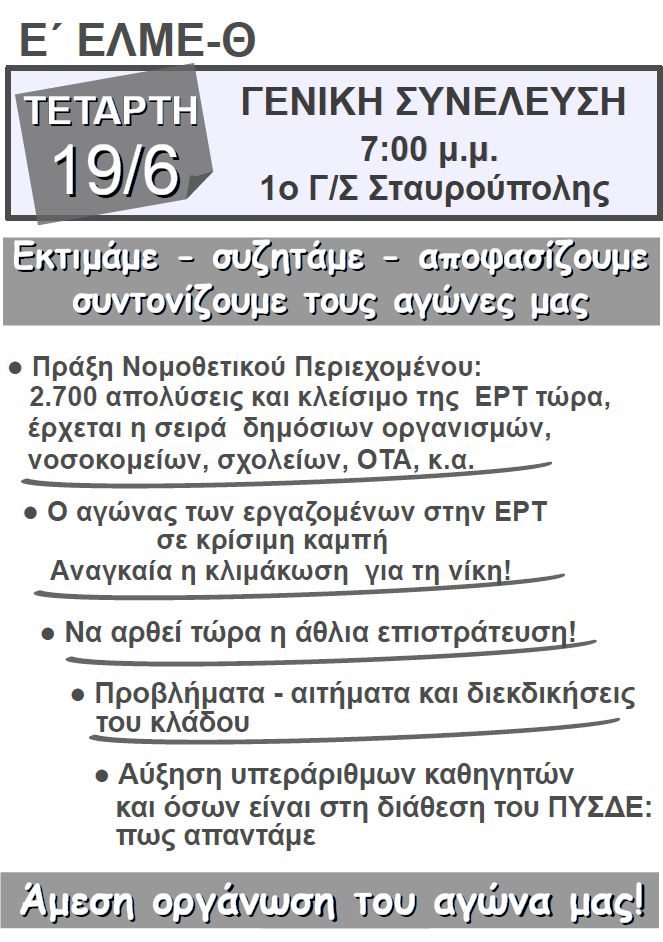 Ε ΕΛΜΕ Θεσσαλονίκης: Κάλεσμα σε γενική συνέλευση 19/6