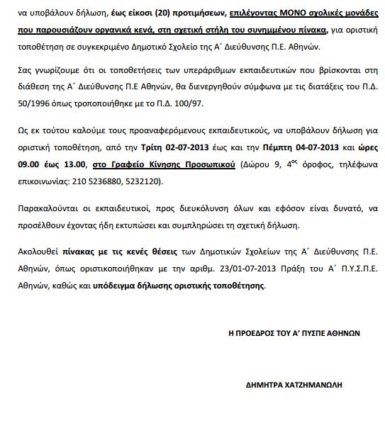Η διαδικασία τοποθέτησης των υπεράριθμων εκπαιδευτικών ΠΕ70 στο ΠΥΣΠΕ Α΄ Αθήνας θα ολοκληρωθεί την Παρασκευή 5 Ιουλίου 2013.