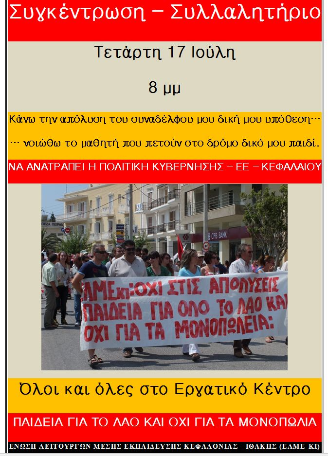 ΕΛΜΕ Κ-Ι.: Ολοι στη συγκέντρωση- Συλλαλητήριο 17/7