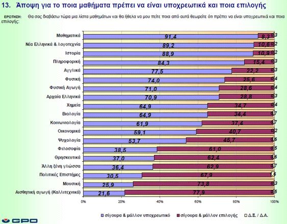 Είναι να απορεί κανείς όταν αγνοούνται εντελώς τα μηνύματα της κοινωνίας και προτείνονται πράγματα εντελώς διαφορετικά. Ανέφεραν, οι πληροφορίες που διέρρευσαν, ότι εισάγονται σαν βασικά μαθήματα στο Γενικό Λύκειο, η «Φιλοσοφία» καθώς και οι «Πολιτικές επιστήμες». Αξίζει να δει κανείς την παρακάτω έρευνα, την οποία διενήργησε το ίδιο το υπουργείο Παιδείας, σχετικά με τη γνώμη του κόσμου για το ποια μαθήματα πρέπει να είναι υποχρεωτικά και ποια όχι και αφού συγκρίνει τα αποτελέσματά της με αυτά που προτείνονται, θα καταλάβει ότι προτείνονται ακριβώς τα αντίθετα: