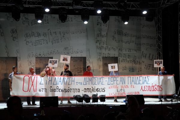 Αντιπροσωπεία των 3 συλλόγων ανέβηκε στη σκηνή του κατάμεστου από κόσμο θεάτρου, άπλωσε πανό και ο πρόεδρος της ΕΛΜΕ Λευκάδας κος Κούρτης Φίλιππος παρουσίασε στο κοινό τα βασικά προβλήματα που αντιμετωπίζει η δημόσια εκπαίδευση απ τις μνημονικές πολιτικές της κυβέρνησης.