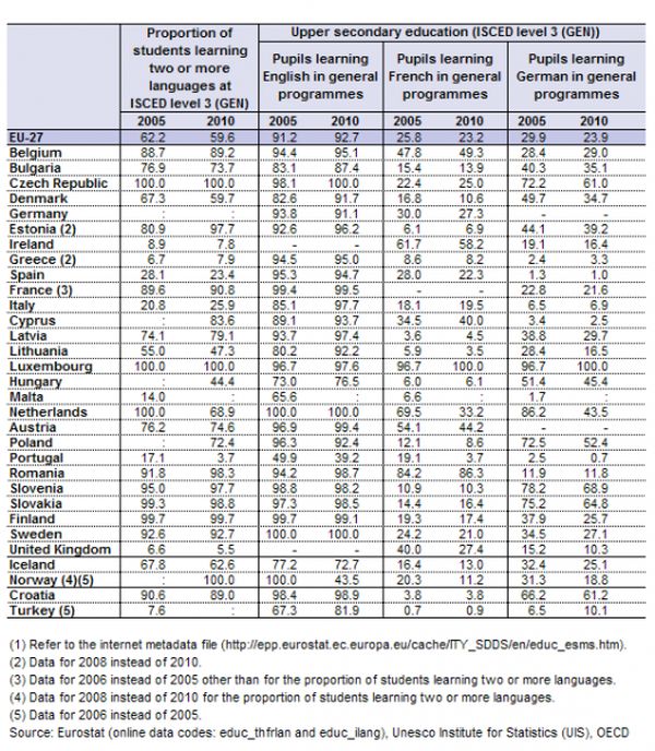 Προς επίρρωση των παραπάνω στοιχείων, παραθέτουμε και σχετικό πίνακα από συγκριτική μελέτη της Eurostat, που αποδεικνύει την ανοδική τάση της διδασκαλίας 2 ή και περισσότερων ξένων γλωσσών στην δευτεροβάθμια εκπαίδευση, με την Αγγλική Γλώσσα να συνεχίζει να είναι η πρώτη ξένη γλώσσα που διδάσκονται οι μαθητές, όπως απέδειξε η προηγούμενη μελέτη.