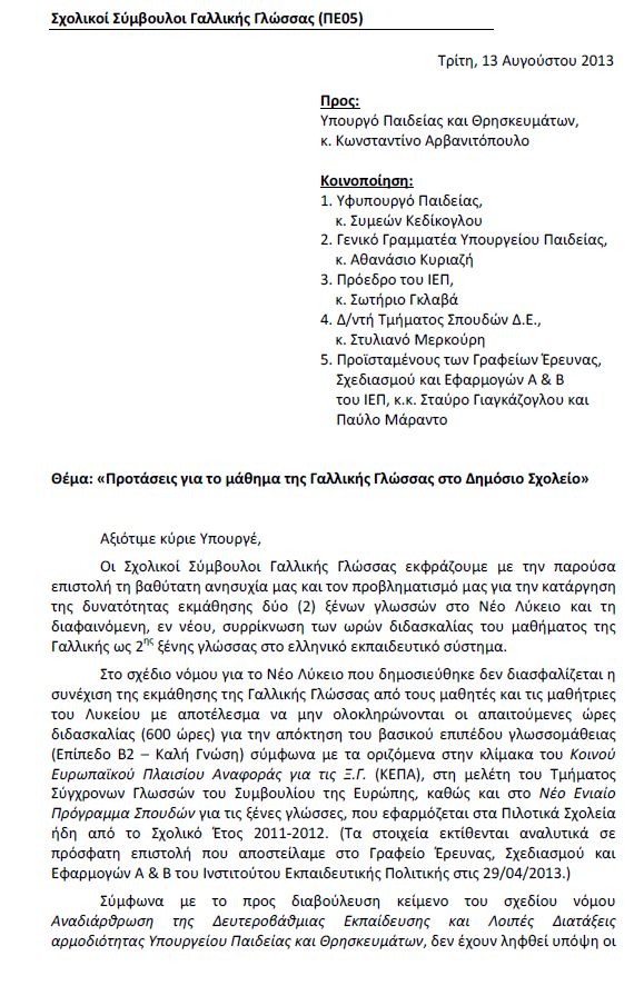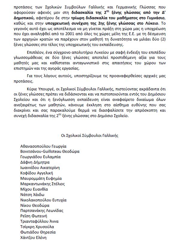 Επιστολή των Σχολικών Συμβούλων Γαλλικής προς τον υπ. Παιδείας