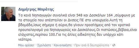 Ο αιρετός του ΚΥΣΠΕ Δημήτρης Μπράτης ανάρτησε στην προσωπική του σελίδα στο facebook ενημέρωση για τις προσλήψεις. Σύμφωνα με τον Δ. Μπράτη τα κενά των νηπιαγωγών είναι συνολικά 548 και των Δασκάλων 164, σύμφωνα με τα στοιχεία που απέστειλαν οι διευθύνσεις ΠΕ στο υπουργείο Παιδείας. Αυτή την εβδομάδα, ίσως σήμερα ή αύριο, θα γίνουν προσλήψεις από τον κρατικό προϋπολογισμό για Νηπιαγωγούς και Δασκάλους.