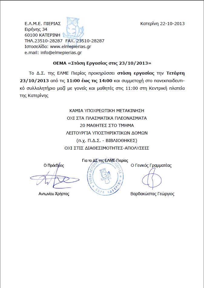 Το Δ.Σ. της ΕΛΜΕ Πιερίας προκηρύσσει στάση εργασίας την Τετάρτη 23/10/2013 από τις 11:00 έως τις 14:00 και συμμετοχή στο πανεκπαιδευτικό συλλαλητήριο μαζί με γονείς και μαθητές στις 11:00 στην Κεντρική πλατεία της Κατερίνης.