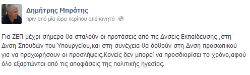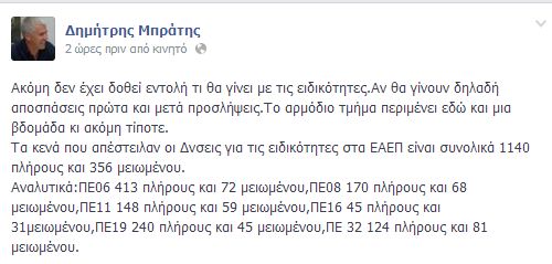 Ακόμη δεν έχει δοθεί εντολή τι θα γίνει με τις ειδικότητες.Αν θα γίνουν δηλαδή αποσπάσεις πρώτα και μετά προσλήψεις.Το αρμόδιο τμήμα περιμένει εδώ και μια βδομάδα κι ακόμη τίποτε.