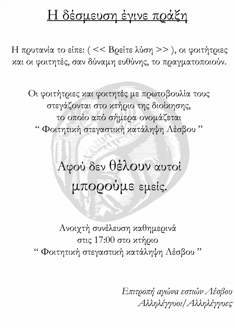 Πιστοί στην αρχική μας θέση, πως το ζήτημα της στέγασης πρέπει να θεωρείται αδιαμφισβήτητο δικαίωμα όλων, συνεχίζουμε μετά από δώδεκα μέρες κατάληψης, με αμείωτη ένταση, τον αγώνα μας για την αξιοπρέπεια. Βρισκόμαστε στην απόλυτα ευχάριστη θέση να έχουμε πλέον την αλληλεγγύη και τη στήριξη και των έξι φοιτητικών συλλόγων της πανεπιστημιακής μονάδας Μυτιλήνης (δύο εκ των οποίων στηρίζουν με φυσική παρουσία την κατάληψη) καθώς και του συλλόγου Δ.Ε.Π., του συλλόγου των διοικητικών υπαλλήλων και του συλλόγου των μεταπτυχιακών φοιτητών ανθρωπολογίας.